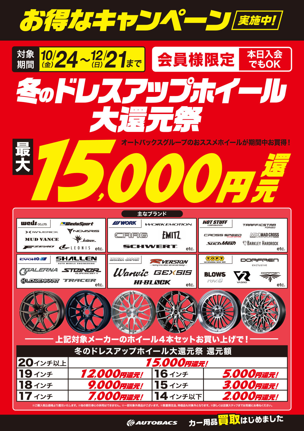 ※ご購入税込み価格より還元いたします。※他の割引券との併用はできません。※一部対象外商品がございます。※数量限定品、特価品も対象外となります。※純正タイヤ・VAN用タイヤ除く。※詳しくは店頭スタッフまでお気軽にお尋ねください。