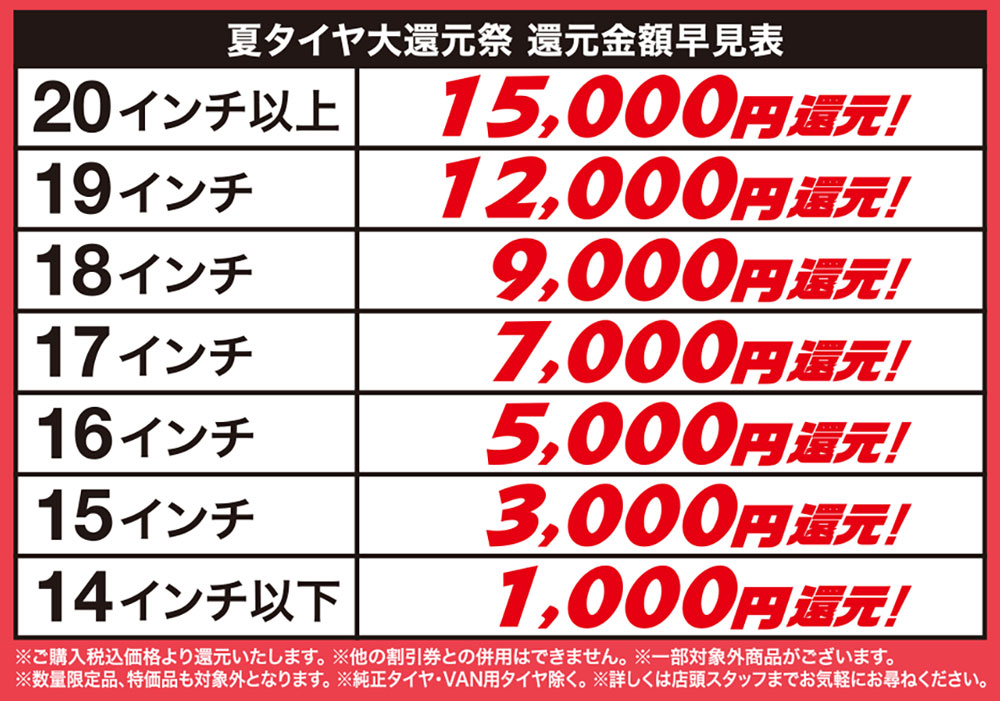 ※ご購入税込み価格より還元いたします。※他の割引券との併用はできません。※一部対象外商品がございます。※数量限定品、特価品も対象外となります。※純正タイヤ・VAN用タイヤ除く。※詳しくは店頭スタッフまでお気軽にお尋ねください。